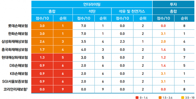 점수표에 따르면 설문에 응답한 9개 보험사 가운데 삼성화재를 제외한 8개 보험사가 석유 및 천연가스 언더라이팅 정책을 수립하지 않은 것으로 나타났다. 석유 및 천연가스 관련 투자제한 정책을 수립한 보험사는 아예 없는 것으로 확인됐다. 점수로 나타내면 석유 및 천연가스를 포함한 화석연료 언더라이팅 정책 평균점수는 10점 만점에 1.5점, 투자정책은 1.7점이다.