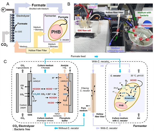 이에 연구팀은 전기화학적 이산화탄소 전환기술과 미생물을 이용한 바이오 전환 기술을 연계해 이산화탄소로부터 바이오 플라스틱을 생산하는 기술을 개발했다. 이 '전기화학-바이오' 하이브리드 시스템은 전기화학 전환반응이 일어나는 전해조와 미생물 배양이 이뤄지는 발효조가 연결된 형태다. 전해조에서 이산화탄소가 포름산으로 전환되면, 이 포름산을 발효조에 공급해 커프리아비더스 네케이터(Cupriavidus necator)라는 미생물이 탄소원을 섭취해 미생물 유래 바이오 플라스틱인 폴리하이드록시알카노에이트(polyhydroxyalkanoate, PHA)가 만들어진다.