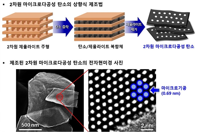 연구팀은 이런 2차원적 기공 연결구조를 지니는 제올라이트 내부에 탄소를 채워 넣은 후, 제올라이트만을 선택적으로 녹여냄으로써 판 형태의 2차원 탄소 물질을 합성하는 데 성공했다. 합성된 탄소는 기존 제올라이트의 마이크로 기공 구조를 그대로 본뜬 골격 구조를 지니며, 극도로 균일한 크기의 마이크로 기공들이 벌집 구조로 빽빽하게 배열돼 있다. 해당 기공 밀도는 기존에 보고되어온 다공성 그래핀과 비교해 수십배 이상 높은 수치다.