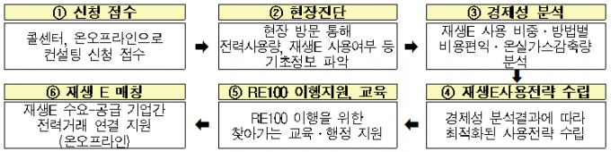 심화컨설팅을 받은 기업은 전력사용량 등 기초정보를 검토하는 현장진단과 재생에너지 사용 비중·방법에 따른 비용편익과 온실가스 감축 분석 결과를 제공받을 수 있다. 이를 토대로 가장 비용효과적인 재생에너지 사용 전략을 세울 수 있고 RE100 이행도 지원받을 수 있다. 기업부담 없이 전문컨설팅업체를 활용해 관련 서비스를 무상으로 제공한다.