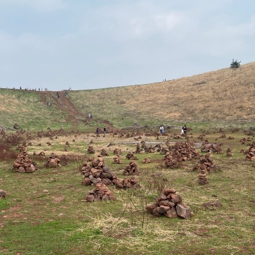 제주 금오름 탐방객 사이에서 유행하는 돌탑쌓기로 분화구의 돌들이 마구 옮겨지면서 맹꽁이 등 양서류가 햇볕을 피할 그늘이 줄고 있다.