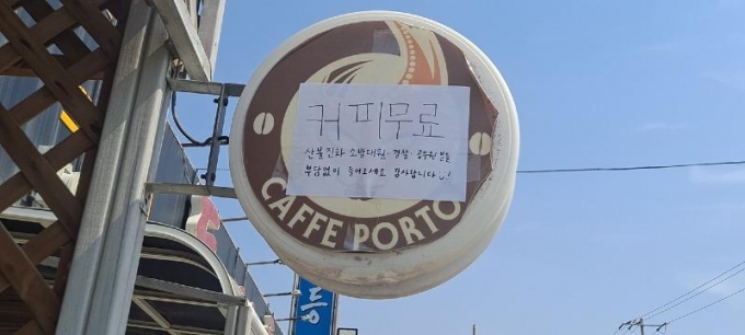 대형 산불로 축구장 2000개가 넘는 면적을 태웠던 홍성 산불현장 인근의 한 카페가 진화작업을 벌이는 공무원들에게 무료커피를 제공한 사연이 뒤늦게 알려졌다.