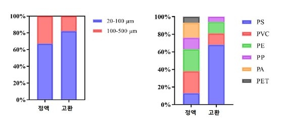 플라스틱 입자는 21.76~286.71㎛의 다양한 크기와 형태로 나타났다. 평균 크기는 96.19㎛였으며 이 가운데 67%는 20~100㎛ 범위 안에 있었다. 연구팀은 정액에서 발견된 플라스틱 유형 비중은 폴리에틸렌(PE)과 폴리염화비닐(PVC)이 각각 25%로 가장 컸다고 밝혔다. 고환에서는 폴리스티렌(PS)이 67.7%로 대부분을 차지했다.