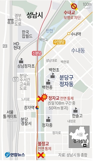 지난 5일 경기도 성남 정자교 보행로 붕괴로 2명의 사상자가 발생하자, 인근의 교량인 불정교와 수내교도 양방향 통행이 차단됐다.