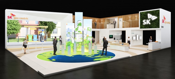 SK지오센트릭은 글로벌 시장을 겨냥한 플라스틱 재활용 사업의 청사진과 고부가 화학소재 중심 사업전략을 선보일 계획이다. '도시유전'을 가능하게 하는 폐플라스틱 3대 화학적 재활용 기술을 모티브로 만든 LED 타워 조형물을 설치하고, 재활용 소재가 적용된 제품과 솔루션을 소개한다. 터치 키오스크에선 울산 ARC(Advanced Recycle Cluster)에 적용되는 핵심 기술을 확인할 수 있다.