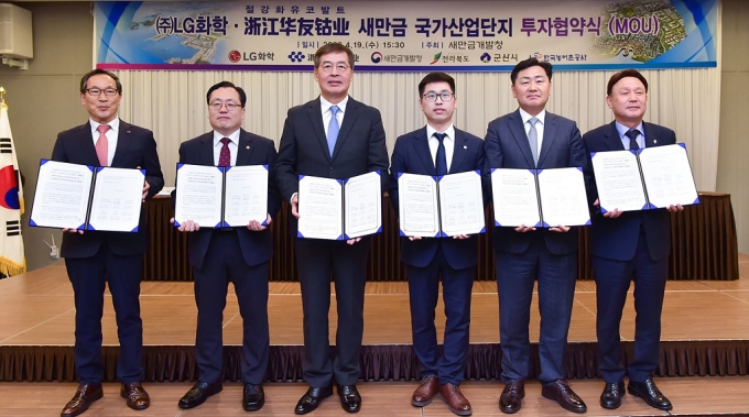 19일 LG화학은 유관기관들과 전라북도 군산시 베스트웨스턴호텔에서 전구체 공장 투자양해각서(MOU)를 체결했다. 협약에는 새만금개발청을 비롯해 투자자로 LG화학과 화유코발트, 지자체·공사로는 전라북도, 군산시, 한국농어촌공사가 참여한다.