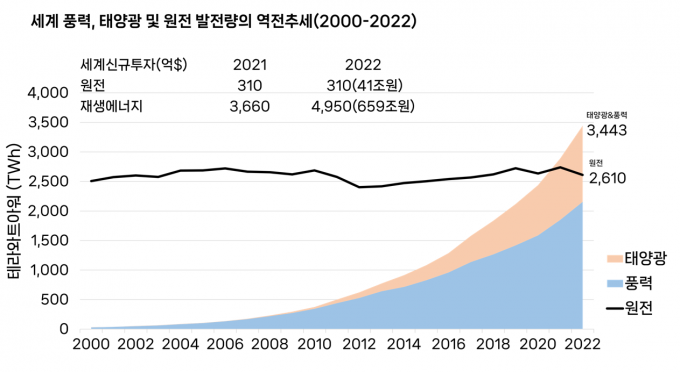 전세계적으로 재생에너지 투자는 폭발적으로 증가하고 있다. 블룸버그 뉴에너지파이낸스(BNEF)는 지난 2022년 한해에만 전세계 재생에너지 투자액이 4950억달러(약 659조원)에 달했다고 했다. 지난해 전세계 재생에너지 발전비중은 29.9%를 기록한 반면 원전 발전비중은 9.2%로 2000년 16.8%보다 크게 감소했다. 원전이 더는 경쟁력 있는 에너지원으로 인정받지 못하고 있는 것이다.