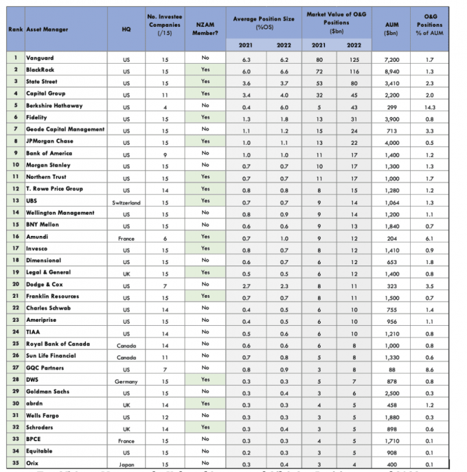 이 보고서에 따르면, NZAM에 가입된 25개 금융회사들은 엑손모빌(ExxonMobil), 셰브론(Chevron), 토탈에너지(TotalEnergies) 등 거대 석유·가스회사 15곳의 지분을 보유하고 있다. 보고서는 "석유와 가스에 투자하는 NZAM 회원사들은 많은 투자자들의 의향을 거스르고 고객들의 투자를 위험에 빠뜨릴 수 있다"고 경고했다.