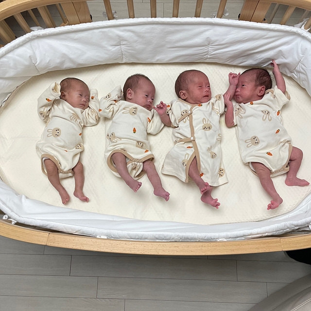 무려 100만분의 1 확률을 뚫은 태어난 네 쌍둥이는 딸 셋에 아들 하나다. 경사의 주인공은 남편 송리원(39)씨와 아내 차지혜(37)씨다. 사실 네 쌍둥이는 지난 3월 16일 당초 예정이었던 5월 10일보다 두달가량 앞서 태어났다. 0.9kg으로 가장 작게 태어난 첫째가 지난주 건강하게 퇴원하면서 네 쌍둥이는 완전체가 됐다.