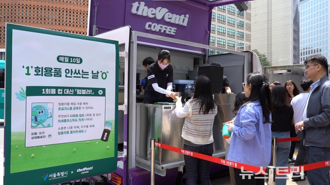 10일 서울광장은 오전부터 시끌벅적했다. 사람들의 손에는 너나 할 것없이 텀블러가 들려있었다. 이들이 텀블러를 들고 향한 곳은 광장 한켠에 마련된 커피차. 이곳에서는 텀블러를 가져오는 사람들에게 무료로 커피나 음료를 나눠주는 '텀블러 데이' 행사가 열리고 있었다.