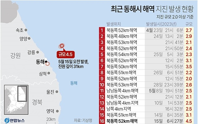 강원 동해시 북동쪽 해역에서 발생한 지진은 올들어서만 벌써 36차례에 이른다. 지난달 23일부터 시작된 동해시 지진은 25일까지 이어졌다. 동해시 북동쪽 50㎞ 해역에서 발생한 이 지진은 규모 3.5로, 약간의 흔들림이 느껴질 정도였다. 하지만 같은 지역에서 15일 오전 6시27분께 또다시 규모 4.5 지진이 발생했다. 규모 4.0 이상 지진은 지난해 10월 충북 괴산군에서 발생한 규모 4.1 지진 이후 약 7개월 만이다.