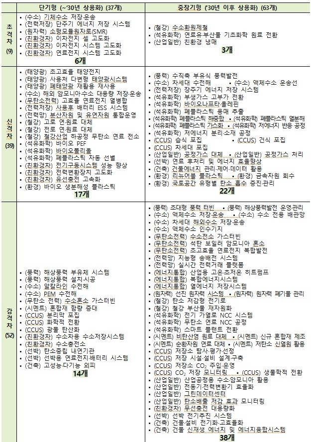 산업 부문에서는 탈탄소화에 주안점을 두고 원료전환·연료전환 등 공정혁신 기술을 중심으로 '철강(6)·석유화학(15)·시멘트(5)·탄소포집저장활용(CCUS·11)·산업일반(7(' 등 5개 분야 44개 기술을 선정했다. 수송과 교통 부문에서는 고성능의 친환경 제품으로 전환하는데 주안점을 두고 '친환경자동차(9)와 탄소중립 선박(4)' 등 2개 분야 13개 기술을 선정했다. 건물·환경 부문에서는 우리 주거형태와 효율적인 국토이용 등을 고려해 '제로에너지건물(4)과 환경(4)' 등 2개 분야 8개 기술을 선정했다.