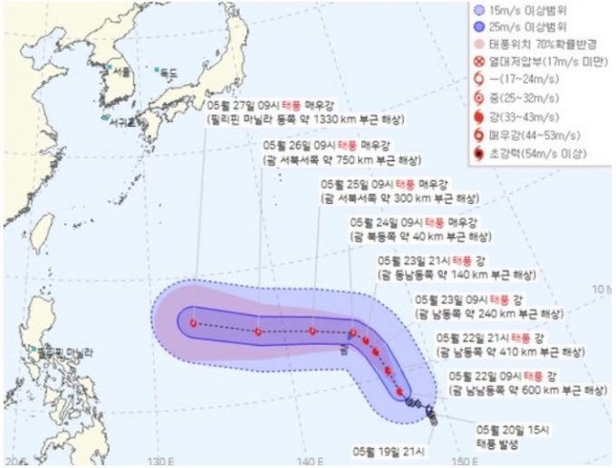태풍은 25일 괌 북서쪽 560㎞ 부근 해상인 일본 오키나와 남동쪽에 자리 잡으며 강도가 '매우 강'으로 세질 것으로 전망된다. '매우 강'은 태풍 강도 분류 가운데 두 번째로 강력한 태풍으로 초속 44m~54m 미만을 뜻하며 사람이나 커다란 돌이 날아갈 수준이다. 지난해 8월 역대급 피해가 우려됐던 태풍 '힌남노'가 초속 50m로 '매우 강' 등급이었다.