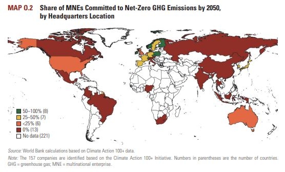 보고서는 "부유국의 다국적 대기업은 개발도상국보다 탄소중립 목표에 더 많이 헌신하고 있다"며 "반면 개발도상국에 본사를 둔 다국적 대기업은 기후위기에 대응하지 않는다"고 비판했다. 이는 다국적 대기업의 탈탄소화 선언에서 극명히 드러난다. 2050년 탄소중립을 선언한 다국적 대기업의 75%는 서유럽에 위치하고 있다. 동아시아와 나머지 유럽지역에 위치한 다국적 대기업의 25~50%가 탄소중립을 약속한 반면 북미와 남미, 아프리카 또는 동남아시아에 본사를 둔 대부분의 다국적 대기업은 탄소중립을 선언하지 않았다.