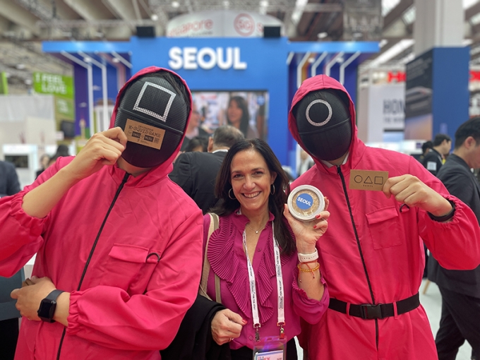 ▲유럽 최대 마이스 전시회 IMEX에 마련된 서울홍보관에서 관람객이 오징어게임 코스튬을 입은 홍보직원과 기념촬영을 하고 있다. (사진=서울관광재단)