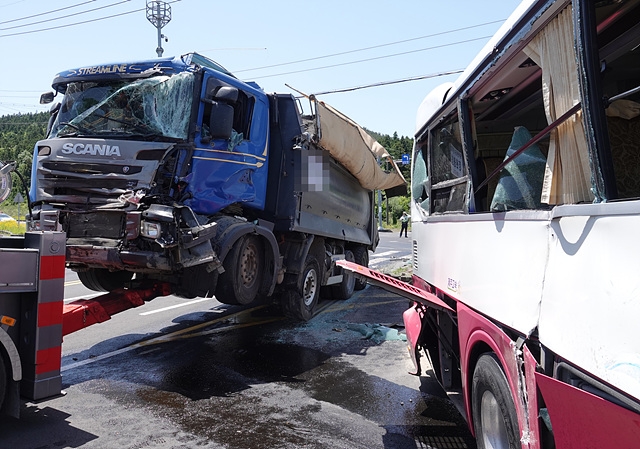 25톤(t) 화물차가 사람들이 타고 있던 관광버스를 들이받는 사고가 25일 제주에서 발생했다.
