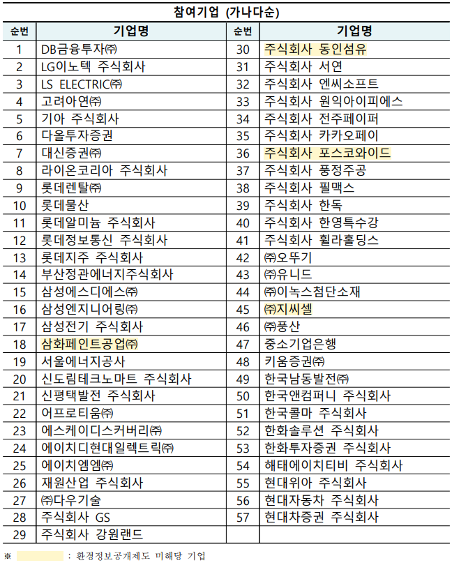 26일 기준 △중소기업은행, △동인섬유, △재원산업, △부산정관에너지, △해태 에이치티비, △강원랜드, △한국앤컴퍼니, △다우기술 등의 정보가 공개된 상태다. 이를 토대로 환경부는 기업의 지속가능경영 보고서 공개 시점, 이를 사업보고서 포함시킬지 별도의 보고서로 발간하도록 할지 여부 등 전반적인 절차를 글로벌 표준에 부합하도록 정비한다는 방침이다.