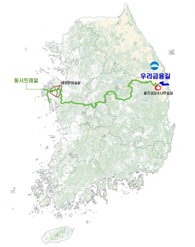 우리금융그룹과 우리금융미래재단은 한반도를 횡단하는 '동서트레일' 시범구간인 '우리금융길' 개통식을 1일 가졌다. 이날 개통식은 경상북도 울진군 한티재에서 이원덕 우리은행장, 남성현 산림청장, 이달희 경상북도 경제부지사, 손병복 울진군수 등이 참석했다.