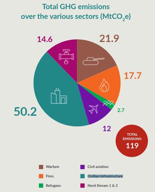 직접적인 전투로 발생한 온실가스는 약 2200만톤에 이른다. 이는 1억2000만톤의 20%에 달하는 배출량이다. 또 포격과 폭격, 폭발로 인한 화재로 발생한 온실가스는 약 1800만톤으로, 이는 전체 배출량의 15%를 차지한다. 보고서에 따르면 1헥타르(2.5에이커) 이상의 면적을 태운 화재 건수는 전쟁이 시작되기전 12개월에 비해 전쟁 첫 해에 36배 증가했다.