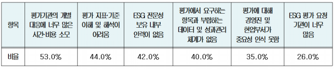 아울러 'ESG 평가대응 관련 어떠한 애로사항이 있느냐'는 질문에 응답기업들은 'ESG 평가사의 개별 평가요청에 대응하는데 많은 시간 및 비용이 소요됨'(53.0%), 'ESG 평가 지표 및 기준을 이해하고 해석하기 너무 어려움'(44.0%), 'ESG 전문성을 보유한 내부인력이 없음'(42.0%) 등의 순서로 답했다.