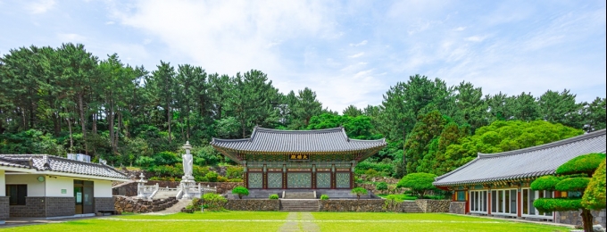 원당봉에는 사찰과 함께 보물 제1887호인 5층석탑이 있다. 국내에서 유일하게 현무암으로 축조된 이 탑은 1층의 기단과 5층의 몸돌이 좁아지는 특이한 양식으로 소담한 멋이 묻어난다.