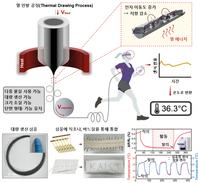 연구팀은 열을 가하면 녹는 고분자와 온도가 바뀌면서 저항이 변하는 나노입자를 혼합해 복합체를 제작하고, 이를 유연하고 폴리에틸렌 시트에 감싸 원기둥 형태의 구조체를 완성했다. 이후 구조체를 열인발공정을 이용해 얇고 유연하며, 안정성이 높은 섬유형 온도 센서를 수백 미터 길이로 대량 생산하는 데 성공했다.