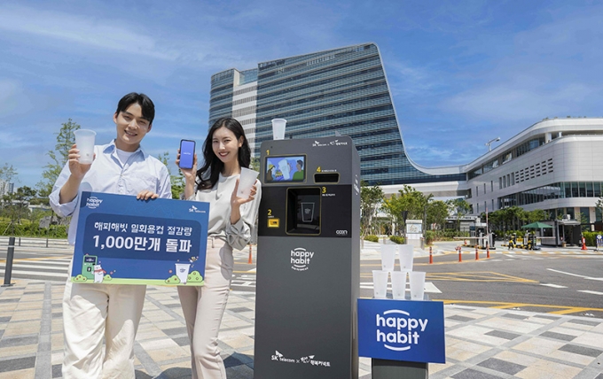 SK텔레콤이 정보통신기술(ICT) 기반의 다회용컵 순환캠페인 '해피해빗' 시행 2년만에 일회용컵 1000만개를 줄였다고 20일 밝혔다. 이는 탄소를 293톤 절감한 효과를 낳았다.