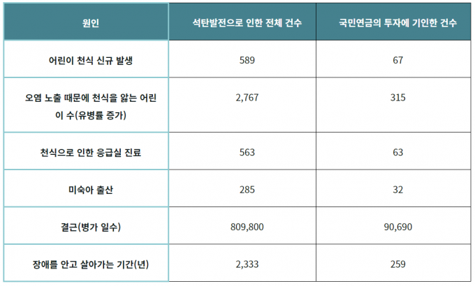 11% 비중을 각종 건강피해에 대입하면 조기사망 220건, 어린이 천식 신규 발생 67건, 미숙아 출산 32건, 천식 관련 응급실 진료 약 63건, 병가 9만690일 등이 국민연금의 석탄투자로 발생했다는 분석이다.