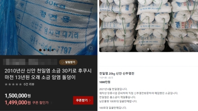 또다른 판매자는 8년 묵은 신안 천일염 소금 20㎏을 선착순으로 판매한다며 가격경쟁을 유도하기도 했다. 이 판매자는 "개당 10만원이다. 8년 전에 샀고 상품 상태도 좋다. 10개 이상 구매하면 조금 깎아드리겠다"고 적었다.