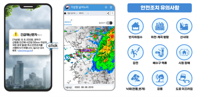 한편 올여름부터 기상청은 1시간 누적 강수량 50㎜인 동시에 3시간 누적 강수량이 90㎜를 넘어서는 '매우 강한 비'가 관측될 경우 해당 지역에 극한 호우 긴급재난문자를 직접 발송할 예정이다. 이렇게 하면 집중호우시 사고 발생까지 20분 정도 추가 골든타임이 확보될 수 있다.