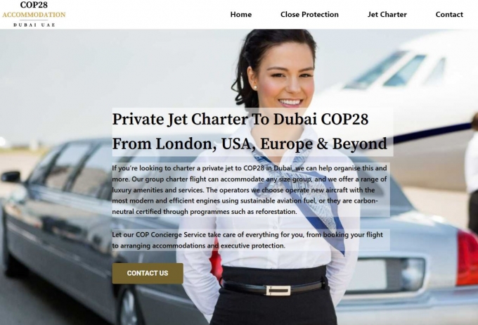 전세기 서비스를 제공하는 COP28 어코모데이션 두바이(COP28 Accommodation Dubai)는 자사 예약 홈페이지를 통해 "우리는 최고의 COP28 컨시어지 서비스"라며 "고위 참석자들에게 전용 제트기 항공편을 예약할 수 있는 기회를 제공한다"고 밝혔다.