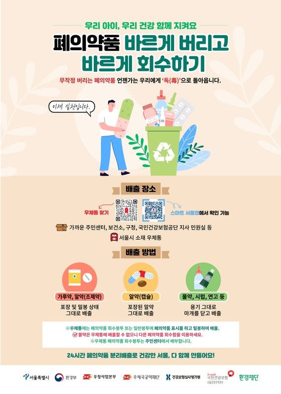 이날 서울시는 서울시청에서 환경부, 우정사업본부, 환경재단, 건강보험심사평가원, 국민건강보험공단 서울강원지역본부, 우체국 공익재단 등과 '폐의약품 바르게 버리고 바르게 회수하기' 업무협약을 체결했다.