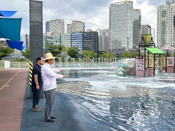 ▲하남시 물놀이장 개장을 앞두고 운영 준비 상태를 점검중인 이현재 하남시장(사진=하남시)