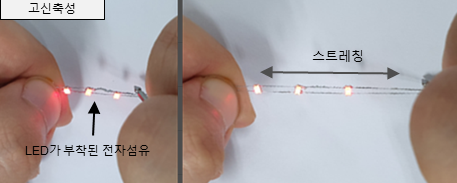 국내 연구진이 쭉쭉 잡아당겨도 성능이 저하되지 않는 '전자섬유'를 개발하는데 성공했다. 이 소재는 길이가 150%까지 늘어나도 전기전도성과 내구성이 떨어지지 않는다.