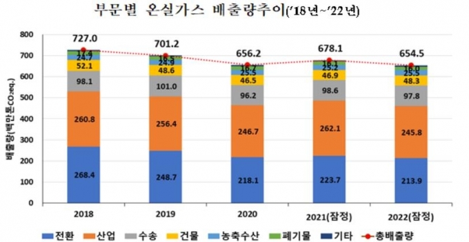 25일 환경부 온실가스종합정보센터는 지난해 국가 온실가스 배출량 잠정치를 이같이 공개하고, 확정치는 내년말 발표할 예정이다. 이는 지난 2021년의 잠정 배출량 6억7810만t에 비해 3.5% 감소한 수준이고, 온실가스 배출량이 가장 많았던 2018년 7억2700만t에 비해 10%나 감소한 것이다.