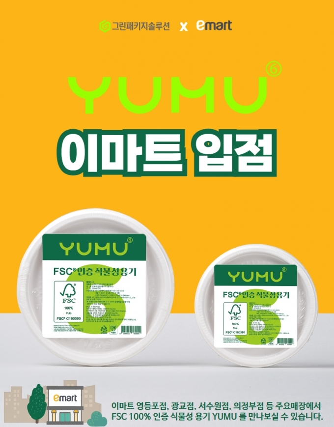 친환경 신소재 패키지 기업 '그린패키지솔루션'은 식물성 일회용기 '유무'(YUMU) 제품들을 이마트를 통해 시판하기 시작했다고 25일 밝혔다.