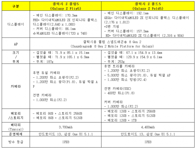 '갤럭시Z 플립5'와 '갤럭시Z 폴드5'는 8월 11일 국내 출시되며, 8월 1~7일 국내 사전판매된다. 갤럭시Z 플립5는 256GB, 512GB 모델이 각각 139만9200원, 152만200원으로 출시된다. 갤럭시Z 폴드5는 256GB, 512GB, 1TB(삼성닷컴, 삼성 강남 전용) 모델이 각각 209만7700원, 221만8700원, 246만700원이다. '갤럭시Z 플립5'는 민트 등 4가지 색상으로 나오며 '갤럭시Z 폴드5'는 아이스블루 등 3가지 색상으로 나온다.