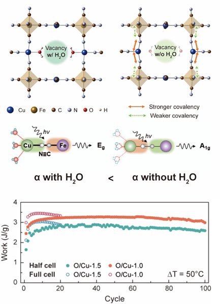 그 결과, 소재가 갖는 물 분자 수가 적을수록 양극 소재 구조의 대칭성이 증가해 물 분자 근처의 전이 금속과 리간드의 결합이 강화되는 것을 확인했다. 결합력이 강해질수록 리간드가 전이 금속이온으로부터 멀어지는 방향으로 진동하는 에너지가 강해지는데, 이 진동으로 엔트로피 변화가 더 크게 일어난다. 이같은 엔트로피 변화는 온도계수의 크기와 밀접한 관계가 있어 결과적으로 TREC 시스템의 효율성을 높일 수 있었다.