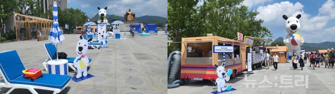 흰디 조형물 주변에는 파랗고 하얀 흰디랜드가 조성돼 있어 경쾌하고 시원한 여름 분위기를 자아냈다. 물총놀이 시설과 더불어 쉼터 카라반과 선베드, 파라솔이 비치돼 있었다. 비치타올을 구매할 수 있는 자판기도 놓여있어서 흡사 휴양지에 놀러온 듯했다. 서울 한복판이라고 믿기지 않을 정도였다.