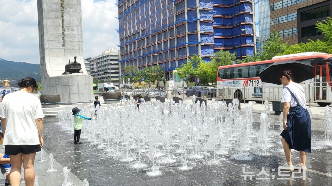 서울 광화문광장에 물놀이장이 개장됐다. 도심 한복판에 물놀이를 즐길 수 있는 워터파크가 마련된 것은 이번이 처음이다.