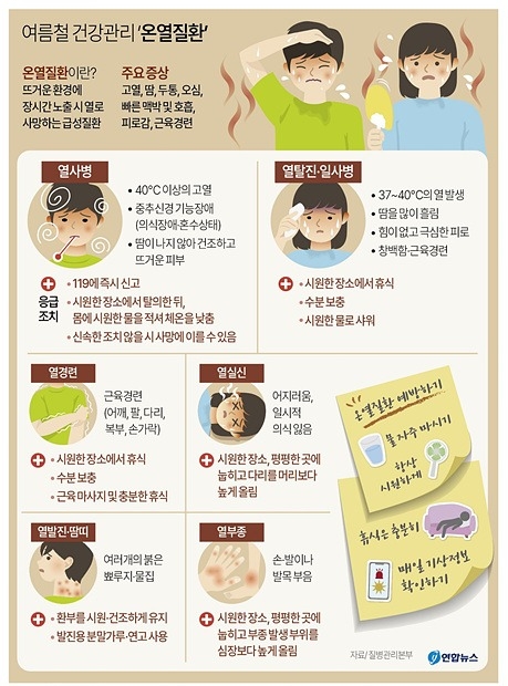 온열질환은 열사병, 열경련, 열실신, 일사병, 열발진·땀띠, 열부종 등이 있다. 이로 인해 두통과 어지럼증, 구토, 메스꺼움, 근육경련, 빠른 맥박과 호흡 등의 온열질환 초기 증상이 나타나면 곧바로 활동을 중단하고 시원한 곳에서 휴식을 취해야 한다.