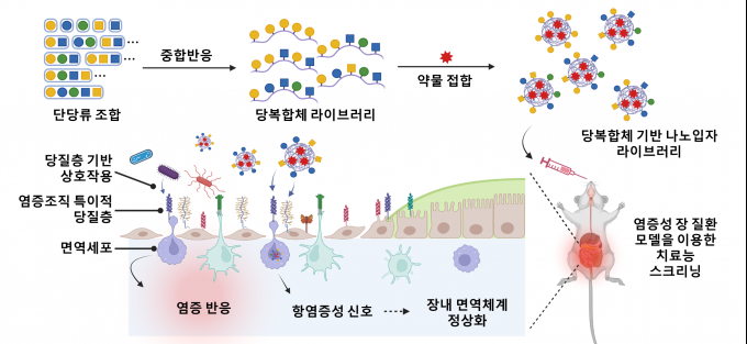 이에 착안해 연구팀은 탄수화물을 구성하는 대표적인 5가지 당으로 수십가지 인공 탄수화물 후보군을 합성해 장염 조직에 형성된 당질층에 잘 결합하는 인공 탄수화물 후보군을 선별했다. 그리고 이를 생쥐에 경구투여해 치료효능이 가장 우수한 탄수화물 나노입자를 선별했다.