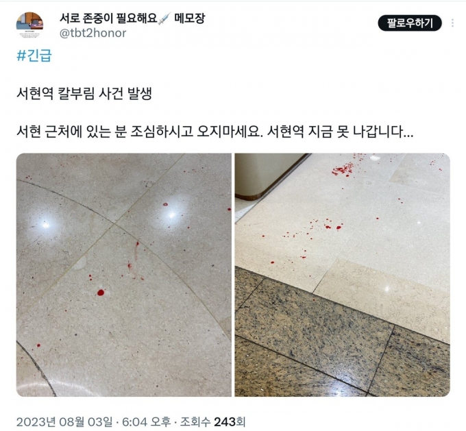한편 지난달 21일 서울시 관악구 신림동에서 피의자 조선(30)이 무차별 칼부림 난동을 일으켜 20대 남성이 숨지는 등 4명의 사상자가 발생하는 사건이 벌어진 데 이어 이같은 흉기 난동이 또 일어나 시민들에게 충격을 주고 있다.