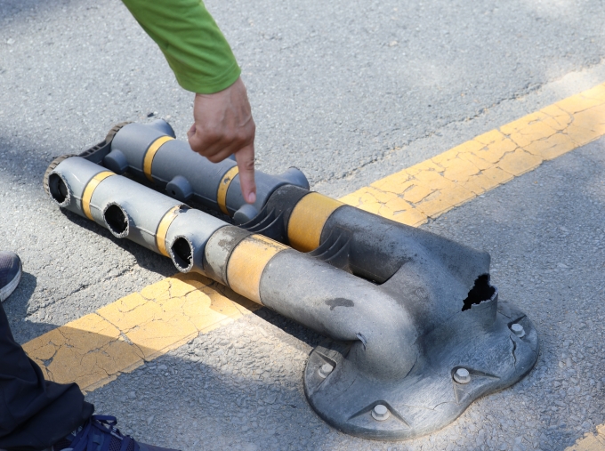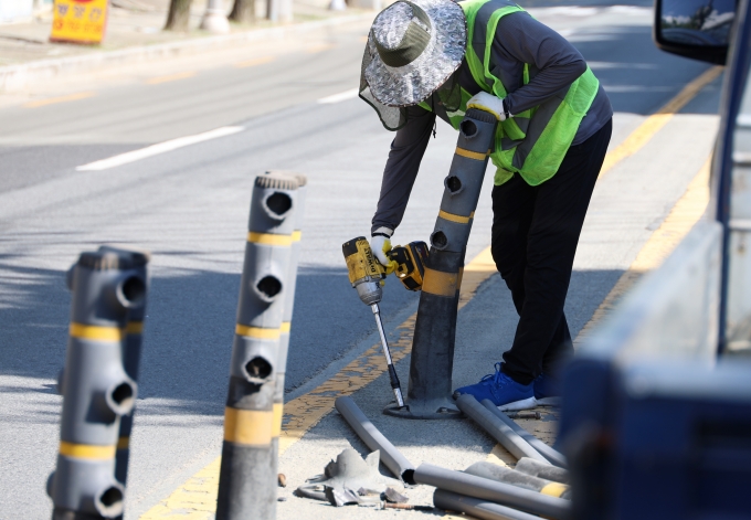 대구 수성구 파동행정복지센터 앞 도로에 설치된 중앙분리대가 지난 2일 오후 2시쯤 힘없이 넘어졌다. 이 시간대는 하루 중 가장 뜨거운 때다. 이날 대구의 한낮 기온은 37.7℃에 달해 '폭염경보'가 내려진 상태였다.