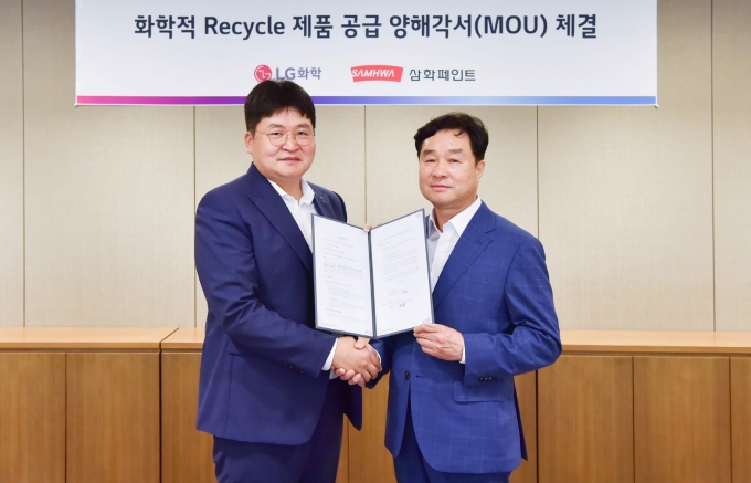 LG화학은 삼화페이트와 폐플라스틱 기반 화학적 재활용 원료 공급에 관한 업무협약(MOU)을 지난 8일 체결했다고 9일 밝혔다. 이번 협약을 통해 LG화학은 재활용 페인트 원료를 삼화페인트에 공급하고, 삼화페인트는 이 원료로 모바일용 코팅재를 만들어 휴대폰 제조사에 공급할 예정이다.