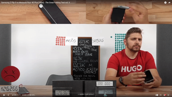 폴란드의 IT 유튜버 'Mrkeybrd'는 지난 3일(현지시간)부터 6일차인 8일까지 '삼성Z플립5 vs 모토로라 레이저40울트라'라는 제목으로 폴더블 스마트폰 내구성 실험을 생중계하고 있다.