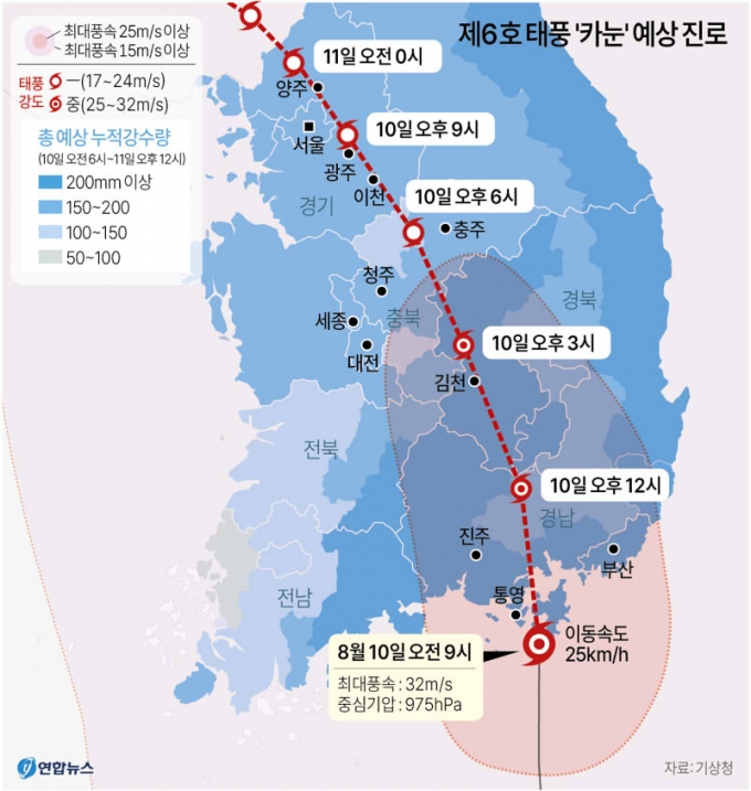 카눈은 10일 밤까지 약 15시간에 걸쳐 한반도를 북진해 수직관통할 것으로 예보됐다. 정오에 대구를 거쳐 오후 9시께 서울을 지난다는 전망이다. 태풍 이동속도는 시속 22㎞로 평균 속도보다 느리다. 이 또한 점차 느려져 자정에는 시속 20㎞까지 떨어질 것으로 보인다. 이 때문에 피해가 더 커질 것으로 우려되고 있다.