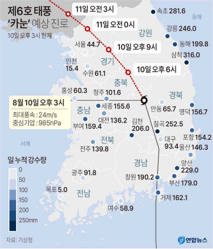 10일 오전 9시20분 남해안에 상륙한 제6호 태풍 '카눈'이 느릿느릿한 속도로 서울로 북상하고 있다. 카눈은 이날 밤 11시쯤 서울에 최근접할 전망이다.