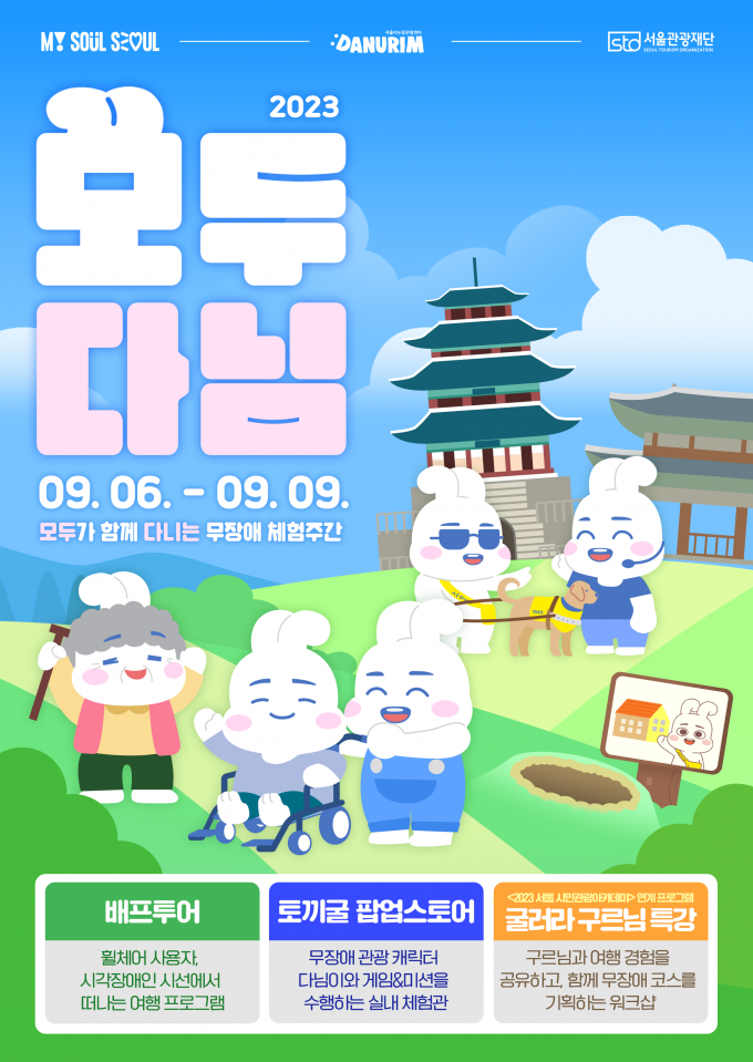 서울관광재단이 오는 9월 27일 '세계 관광의 날'을 기념해 오는 9월 6일부터 9일까지 4일간 서울다누림관광센터와 서울 관광지 일대에서 모두가 함께 다니는 무장애 체험주간 '모두다님'을 개최한다.