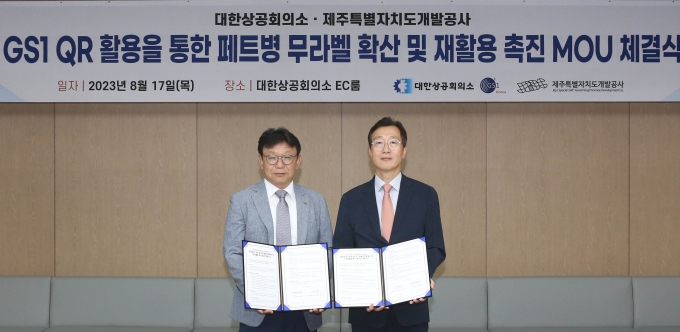 대한상공회의소는 17일 서울 상의회관에서 제주특별자치도개발공사와 'GS1 QR 활용을 통한 페트병 無라벨 확산 및 재활용 촉진' 양해각서(MOU)를 체결하고, 8월말부터 생산하는 '제주삼다수'에 라벨 대신 QR코드를 도입하기로 했다.